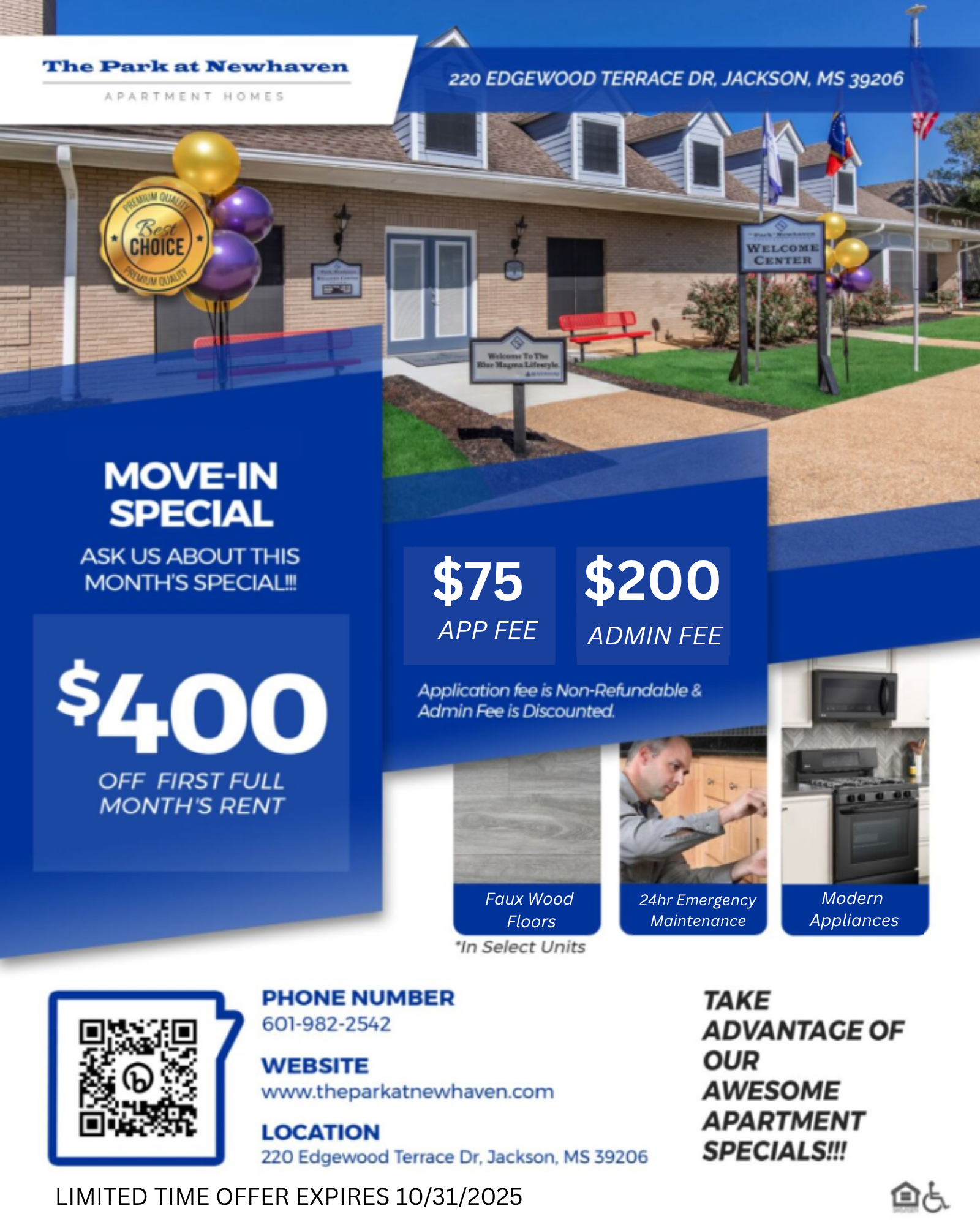 đ October Specials Are Here! đ Take advantage of our limited-time Move-In Deals and step into the comfort and convenience youâve been waiting for. đĄ $400 Off First Full Monthâs Rent Whether youâre starting fresh or upgrading your lifestyle, October is the perfect time to make your move! đ˛ Call or visit us today â these fall savings wonât last long! đ
